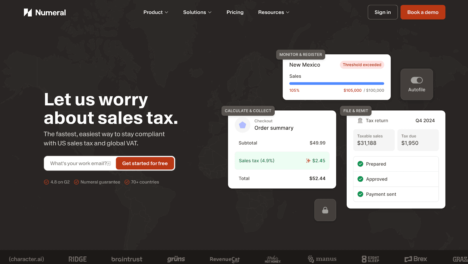 Numeral is designed specifically for the modern tech stack, making it a top choice for startups and software companies that find legacy tools like Avalara too clunky. Unlike traditional plugins that just calculate tax, Numeral focuses on Ledger Reconciliation—it connects to QuickBooks Online to ensure that the revenue you recognize matches the tax you collected and filed. It offers a white-glove service where they handle state registrations and filings for you, ensuring you remain compliant as you scale into new states.