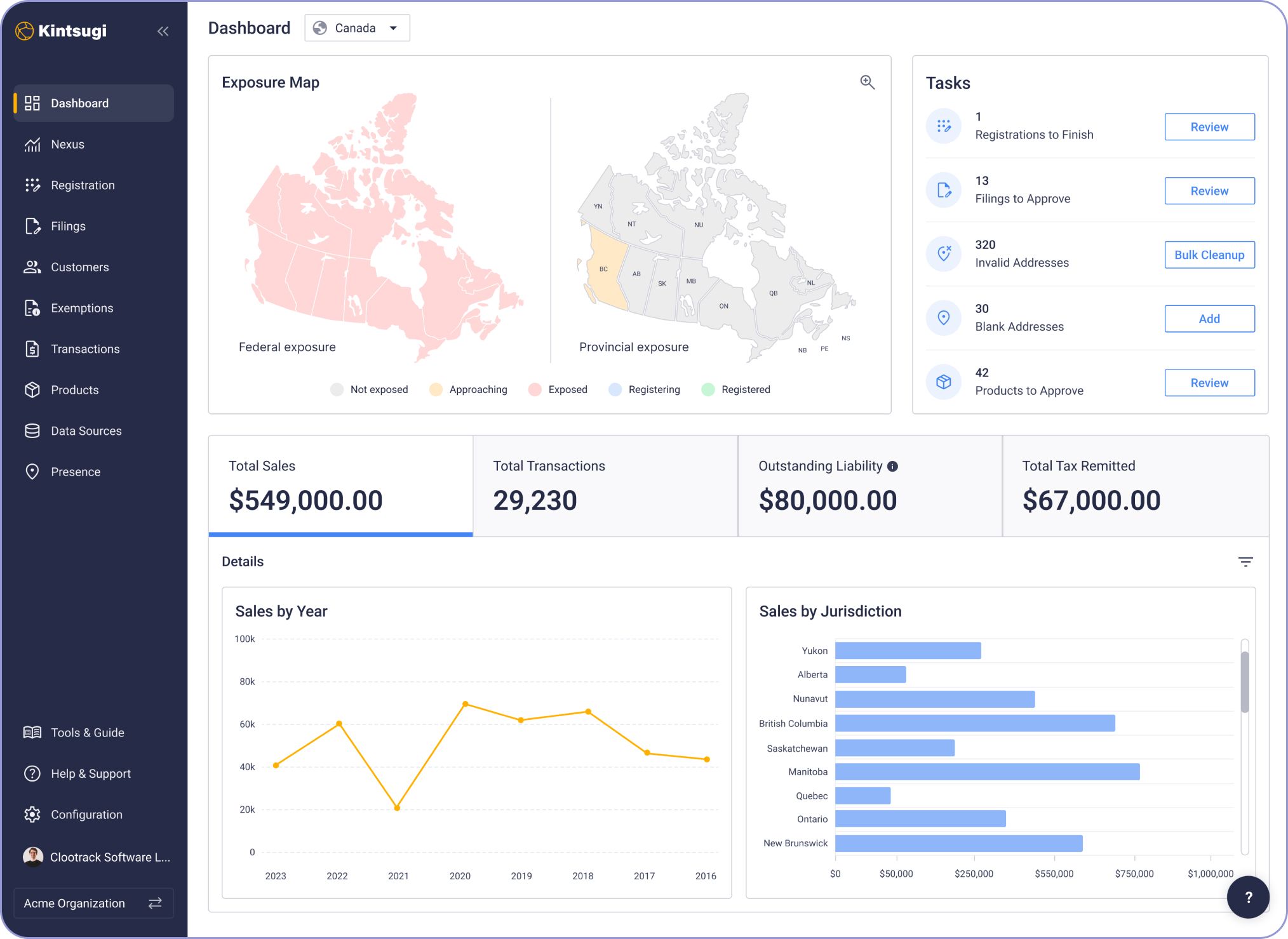 This new functionality will be gradually rolled out to our existing customers and will be publicly available by January 1, 2025. Existing customers can contact support to enable this feature for their organizations. Once enabled, the Kintsugi app will start monitoring nexus for Canadian jurisdictions, allowing you to register and file with just a click.