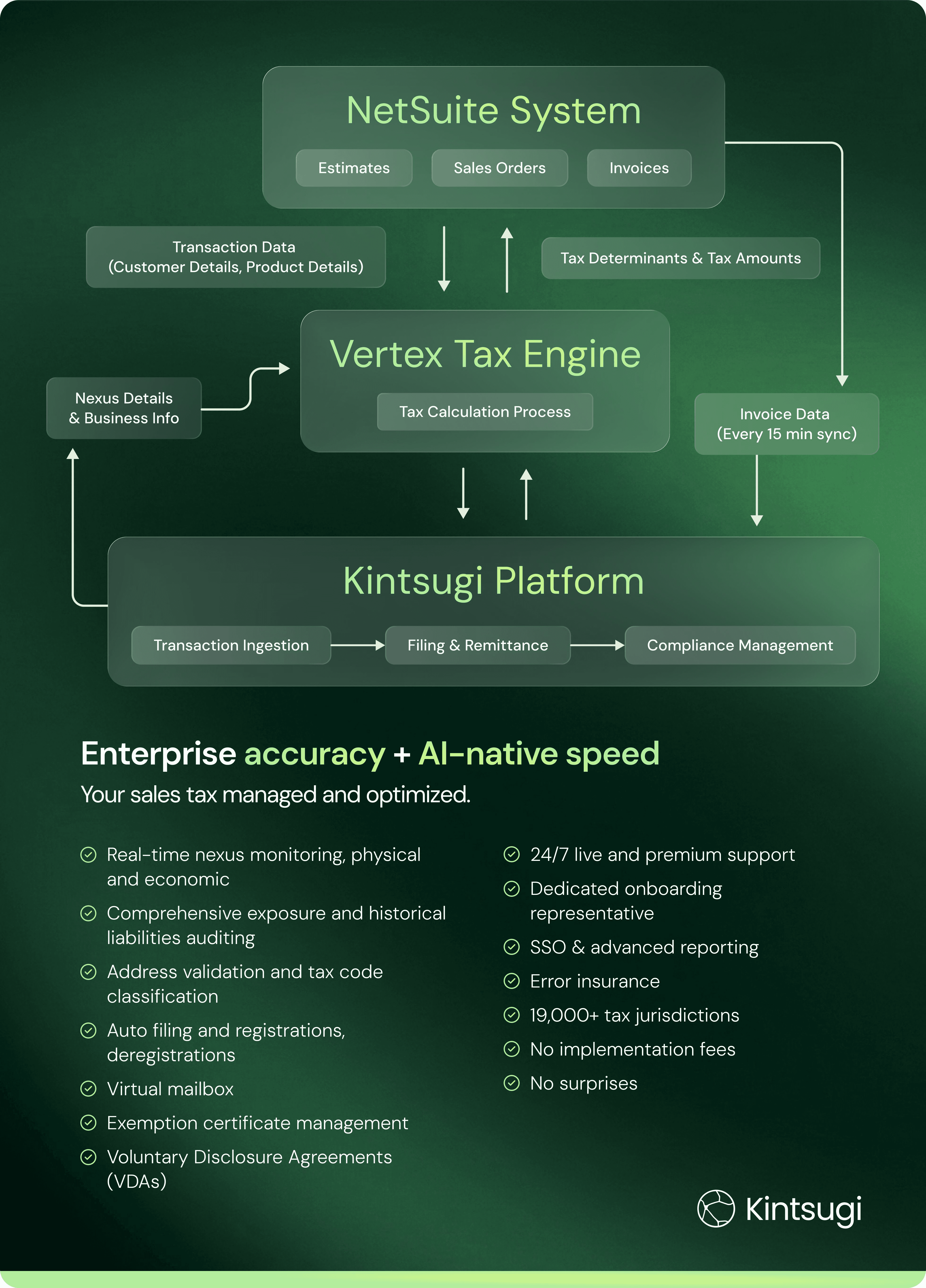 Introducing Kintsugi powered by Vertex for NetSuite SuiteTax. This enhanced partnership brings together three powerful pieces: NetSuite's financial backbone, Kintsugi's AI-driven automation, and Vertex's enterprise-grade tax calculation engine. They deliver a seamless flow from order and cash to tax and filing, all handled automatically within your existing NetSuite environment.