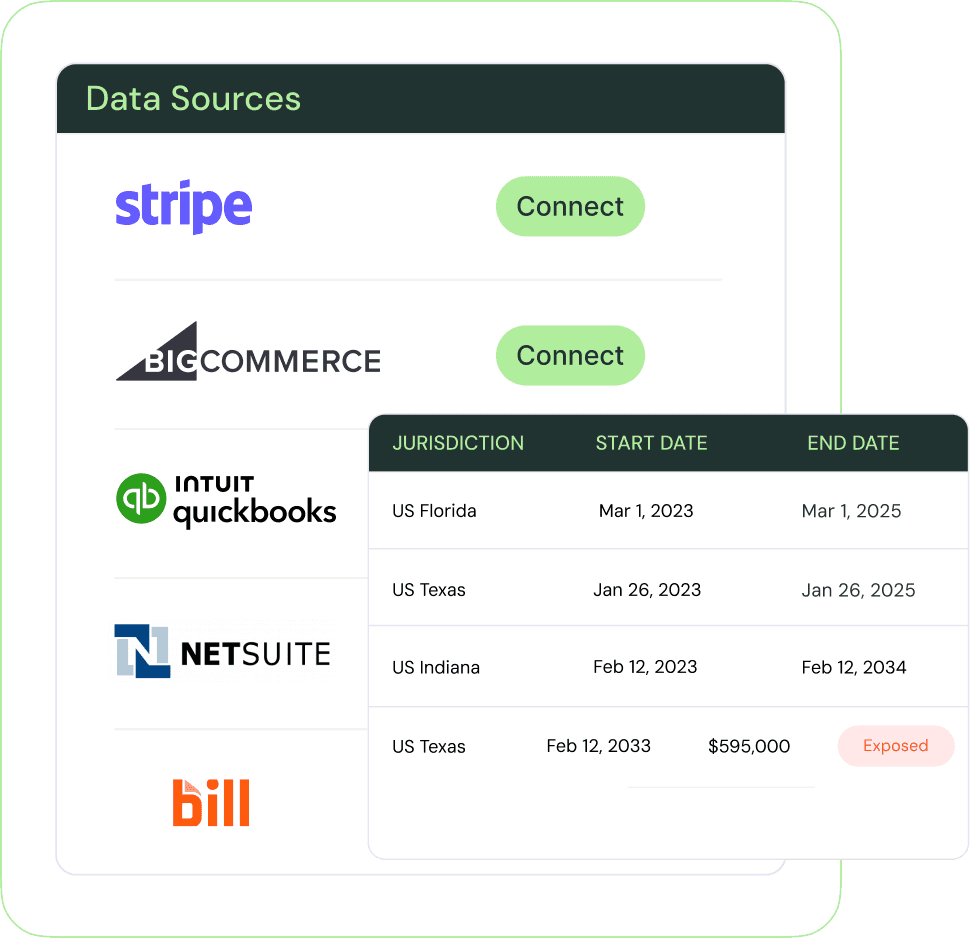 Connect with a click and sync your transactions in real-time. Track your nexus exposure and tax liabilities and ensure compliance everywhere you sell.