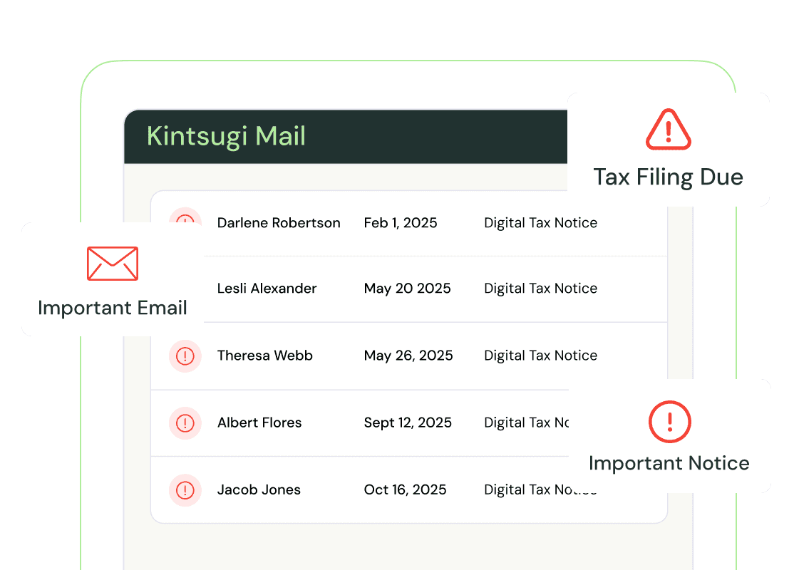 Kintsugi Mail is your always-on mailbox, allowing you to bring together all your physical and digital tax notices in one place. Never miss an important message.