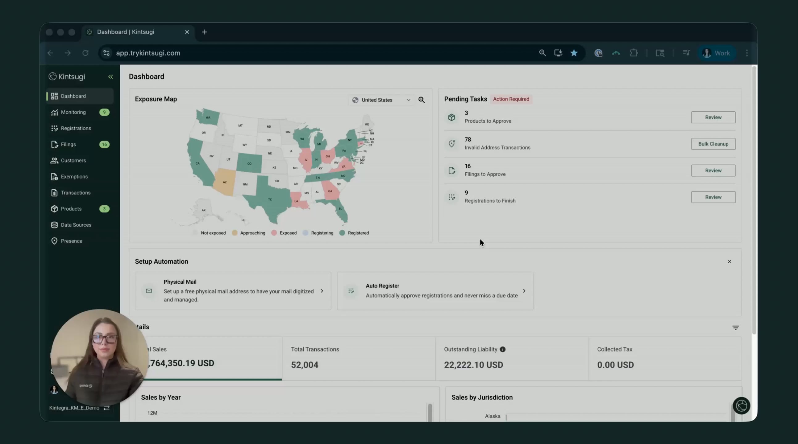 Kintsugi monitors sales activity and alerts you the moment you approach or exceed nexus thresholds, so you stay ahead of compliance before it becomes a problem.